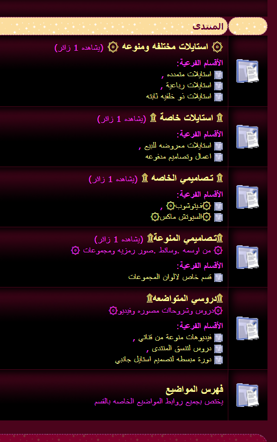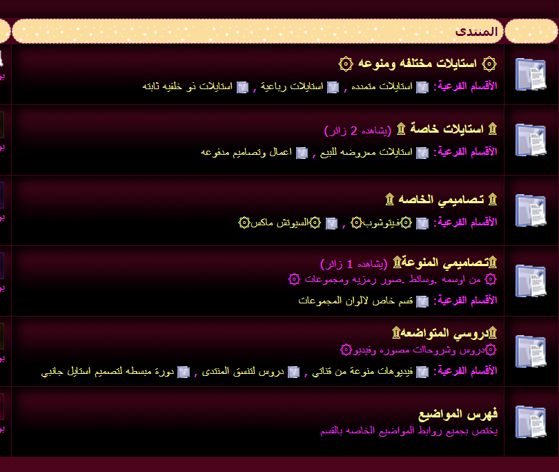 ![]() ![]() ![]() ![]() ![]() ![]() ![]() ![]() ![]() ![]() ![]() ![]() ![]() ![]() ![]() ![]() ![]() ![]() ![]() ![]() ![]() ![]() ![]() ![]() ![]() ![]() ![]() ![]() ![]() ![]() | كود لجعل الاقسام الفرعيه عموديه السلام عليكم ورحمة الله وبركاته طلب من احد اعضائنا الغالين في حل مشكله قلت فرصه اعرضها في موضوع حتى الكل يستفيد وانا صراحة من فتره ابحث عن هاي الكود والطريقه مالكم بالطويله اتفضلو الشرح طريقه لجعل الاقسام الفرعيه بشكل عمودي اولا: نقوم بالدخول الى لوحة تحكم الادارة.. ثم تختار الاستايل الا راح تعدل فيه او تضيف كود التعديل ثانيا: نقوم بالضغط على الاستايلات والقوالب/البحث في القوالب اكتب في خانة البحث : forumhome_subforumbit_post بعدها قم باستبدال مافي داخل القالب بهذا: كود بلغة HTML: <br> <img class="inlineimg" src="$stylevar[imgdir_statusicon]/subforum_$forum[statusicon].gif" alt="" border="0" id="forum_statusicon_$forum[forumid]" /> <a href="forumdisplay.php?$session[sessionurl]f=$forum[forumid]">$forum[title]</a> قبل ![]() بعد ![]() والا موجود في احد الاستايلات مسبقااا وحابب يرجعه للافتراضي يستبدل الكود بهذا كود بلغة HTML: <img class="inlineimg" src="$stylevar[imgdir_statusicon]/subforum_$forum[statusicon].gif" alt="" border="0" id="forum_statusicon_$forum[forumid]" /> <a href="forumdisplay.php?$session[sessionurl]f=$forum[forumid]">$forum[title]</a> | |